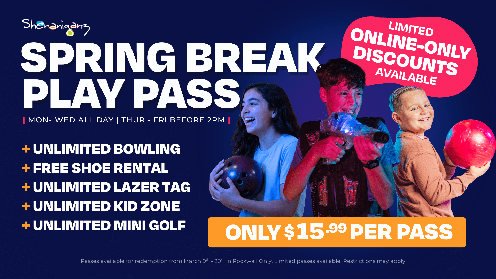Spring Break unlocked at Shenaniganz. Get a 4-hour Spring Break Play Pass with unlimited attractions for one low price. Limited-time savings—grab your pass before they’re gone.
